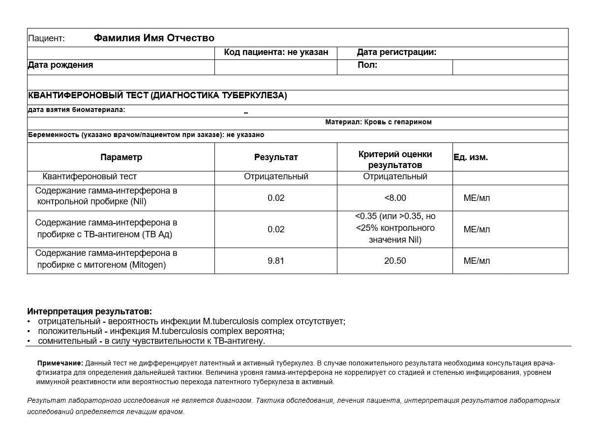 T-SPOT тест (квантифероновый тест) — это современный диагностический тест, который показывает наличие или отсутствие инфекции туберкулеза в организме. Результат T-SPOT теста помогает выявить латентную форму туберкулеза. Результаты оформляются на официальных бланках с печатями и подписью врача-фтизиатра.